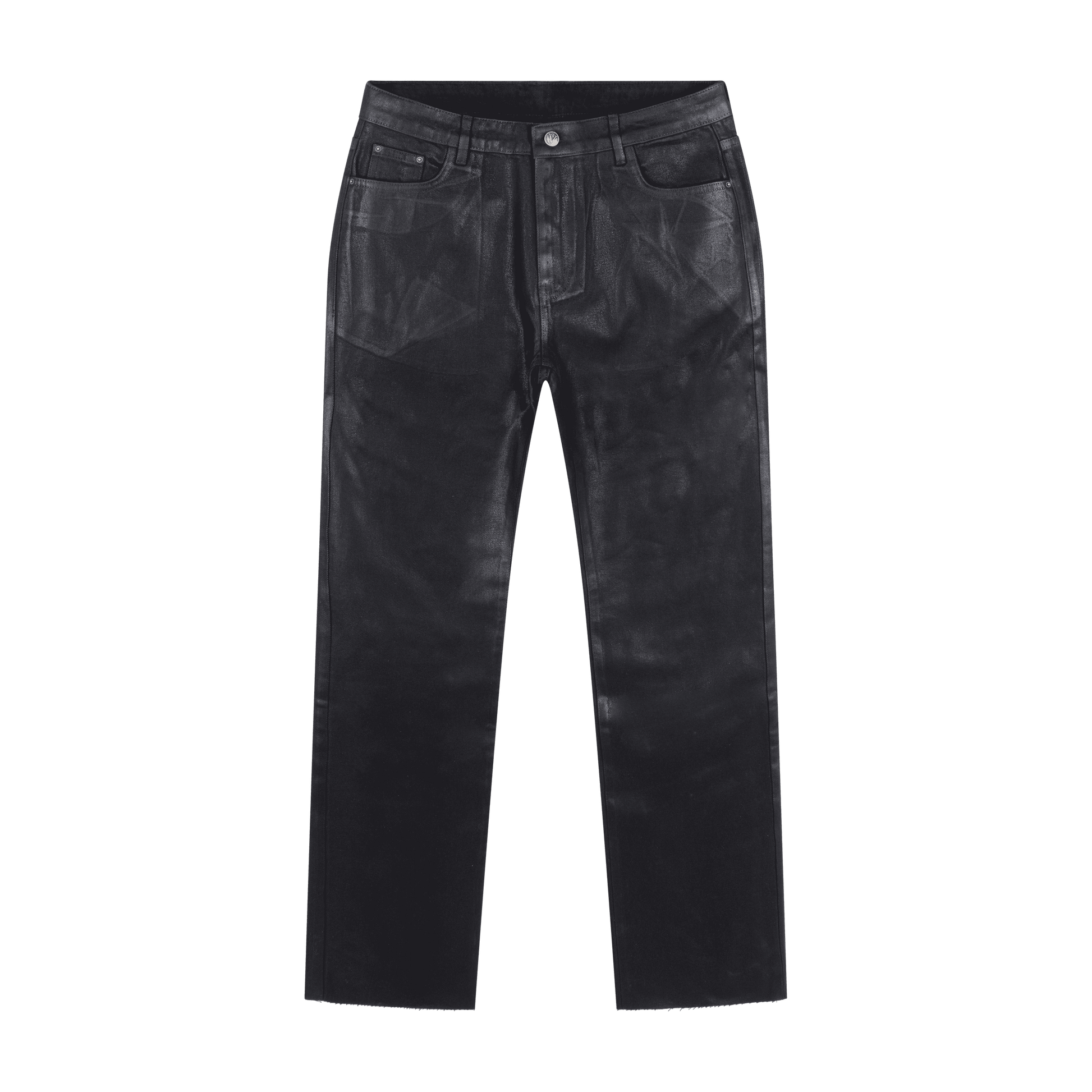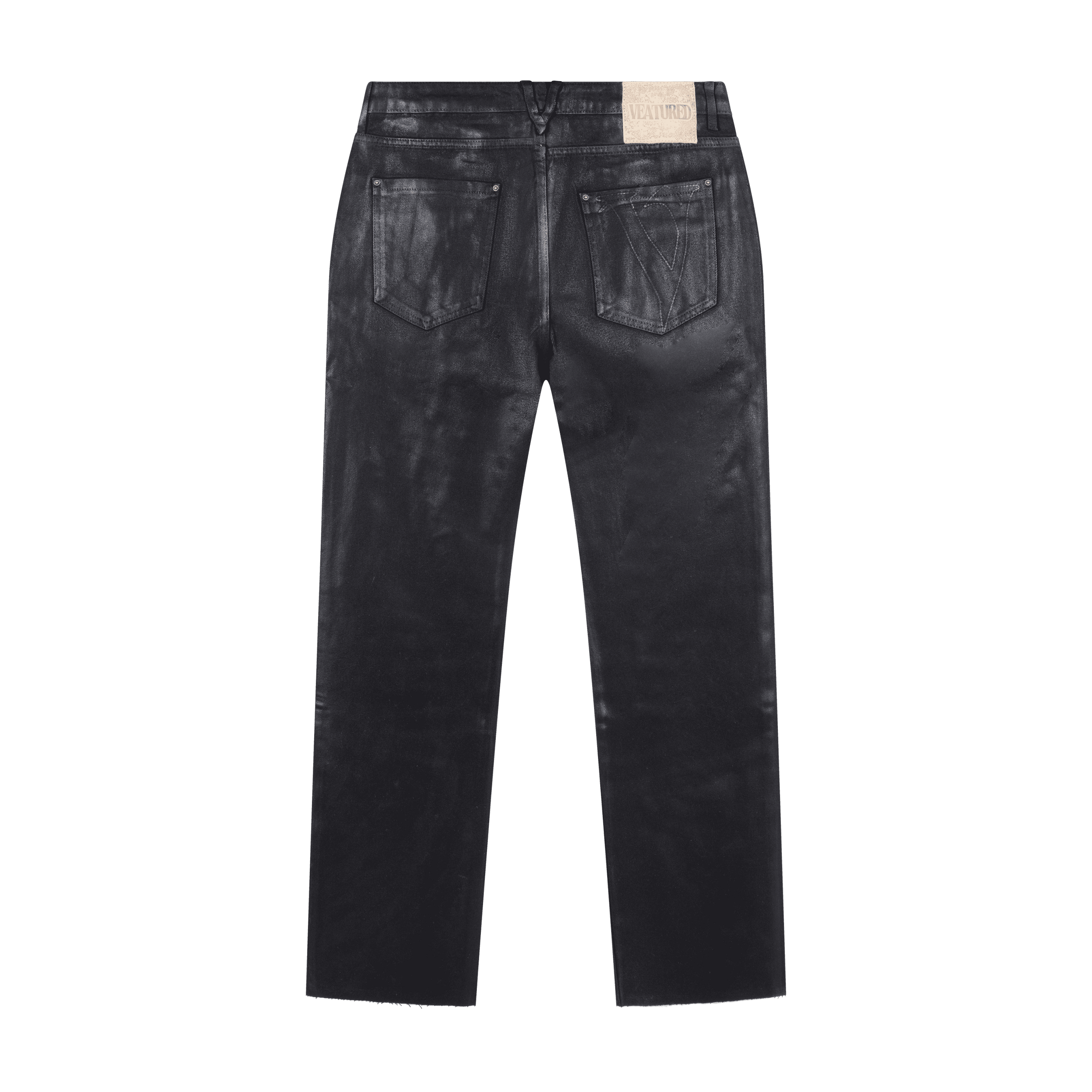 The jeans are made from cotton and feature a coated wash that creates a subtle leather-like sheen with added depth and texture.